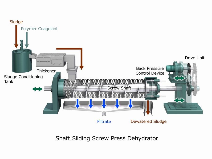 - Our sludge dehydrator is capable of producing targeted moisture content of sludge even if the feed sludge characteristics have changed. This is achieved with a combination of the best fitted thickener as pre-treatment and the following unique screw press dehydrator that has shaft sliding mechanism to adjust the position of the screw shaft during operation for efficient dewatering.