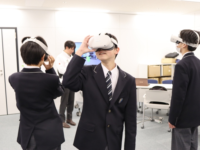 はじめに、水インフラの役割や仕事の内容について紹介し、水処理施設が私たちの暮らしをどのように支えているかを解説しました。続いて、VR(仮想現実)を活用した下水処理場の疑似見学を行い、処理場の内部や、きれいになった水が川へ放流されるまでの流れを臨場感のある映像で体験してもらいました。参加した生徒の多くはVR体験が初めてで、「すごく楽しかった」「施設の中は全然知らない世界だった」といった声も聞かれました。